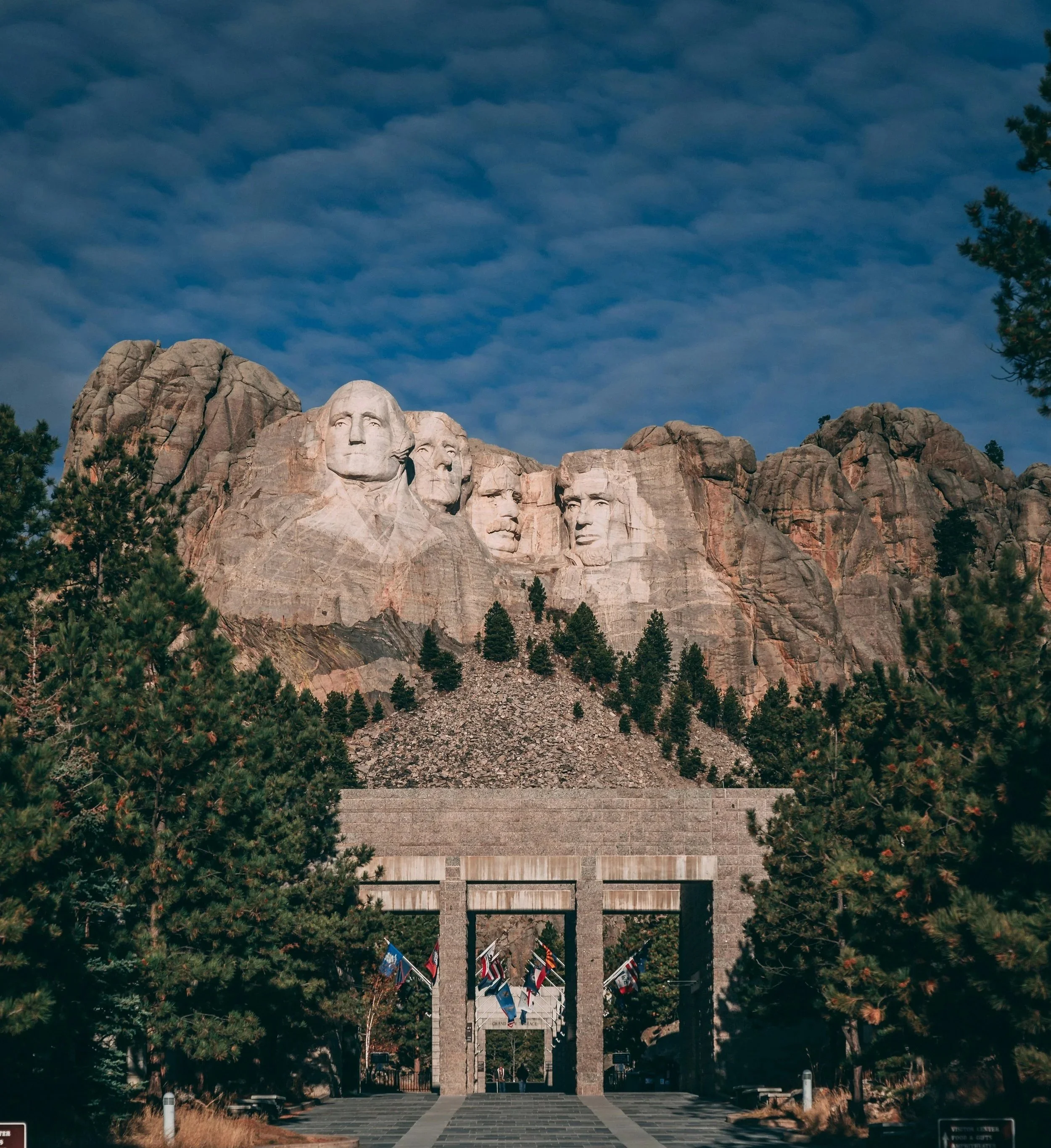 Mount Rushmore and Iron Mountain Road at dusk, culminating in the iconic evening lighting ceremony beneath the illuminated presidential faces
